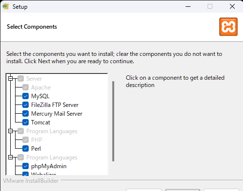 - インストールを進めて、以下の画面でApacheとMySQLにチェックが入っていることを確認しインストールを継続