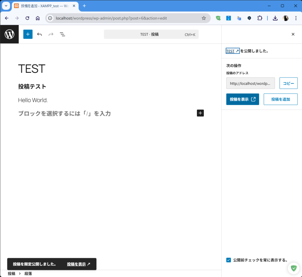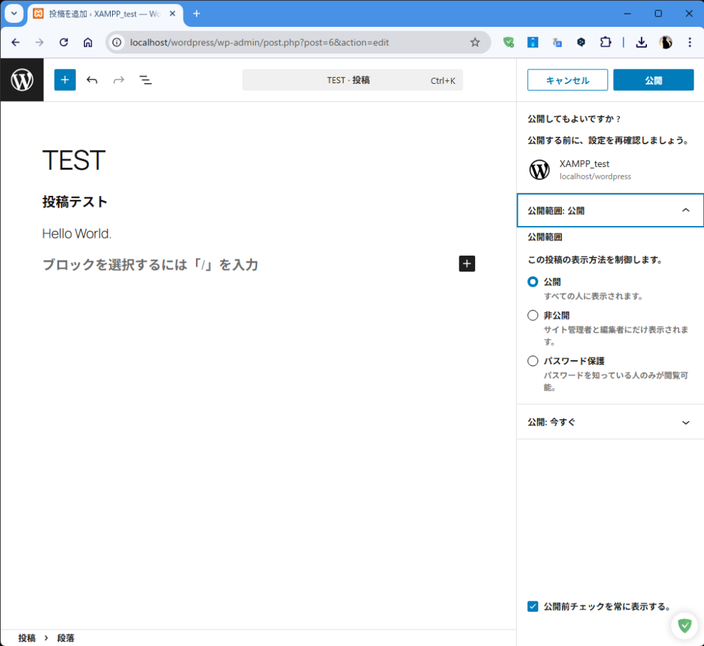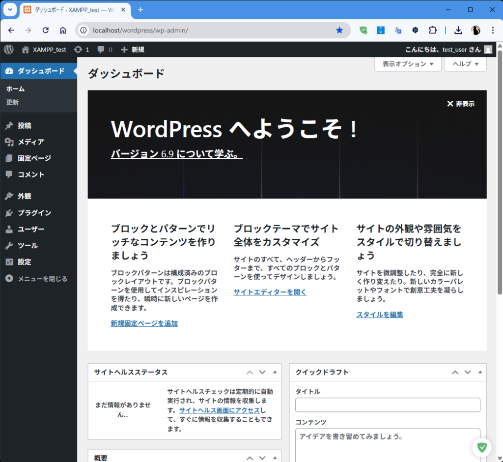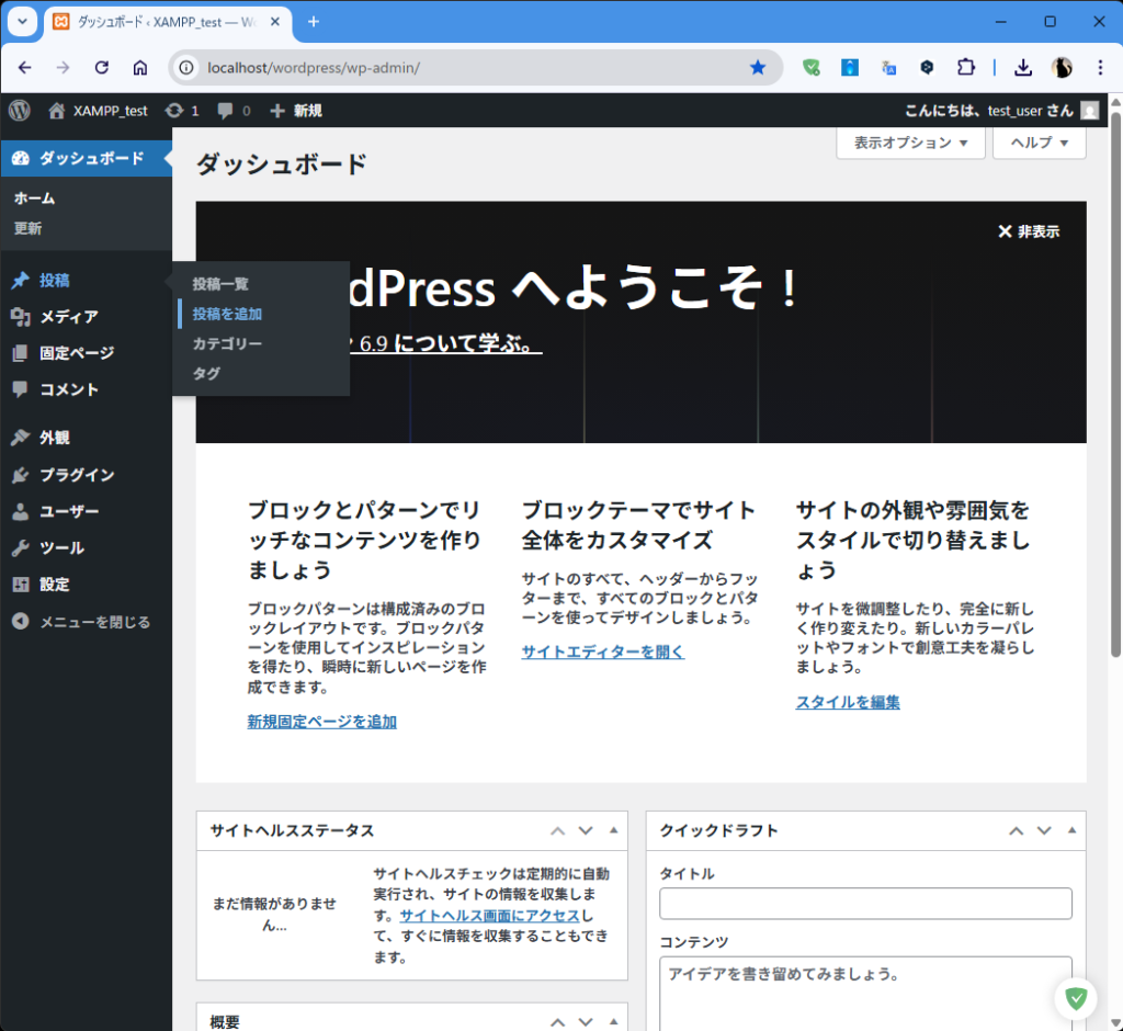 | ログイン | http://localhost/myblog/wp-admin/ で管理者ログイン |