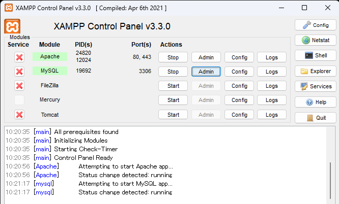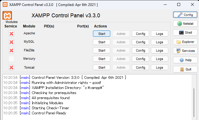 - XAMPP Control Panel v3.3.0が起動する為、ApacheとMySQLの順に「Start」をクリック