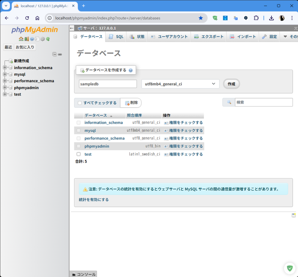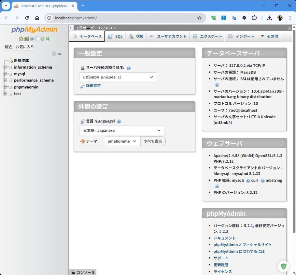 - 左ペインに、作成したデータベースが表示されたらphpMyadminの操作は完了
