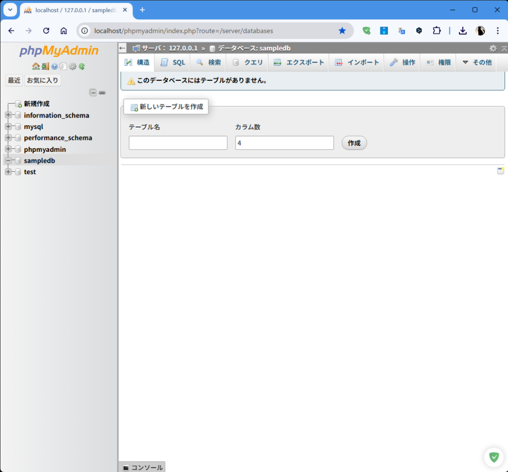 - 以下の通り、データベース名(ここでは「sampledb」とする)を入力し、作成をクリック