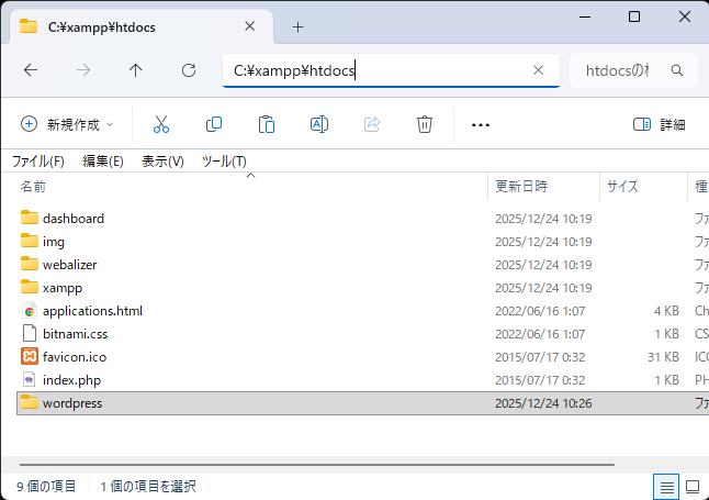 - 「C:\xampp\htdocs」ディレクトリに「wordpres」をペースト