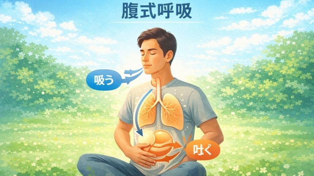 最も手軽で効果的な方法です。鼻からゆっくり4秒かけて吸い、8秒かけて口からゆっくり吐きます。呼吸を意識的にコントロールすることで迷走神経が直接刺激され、副交感神経が活性化します。1日数分行うだけでも効果が期待できます。