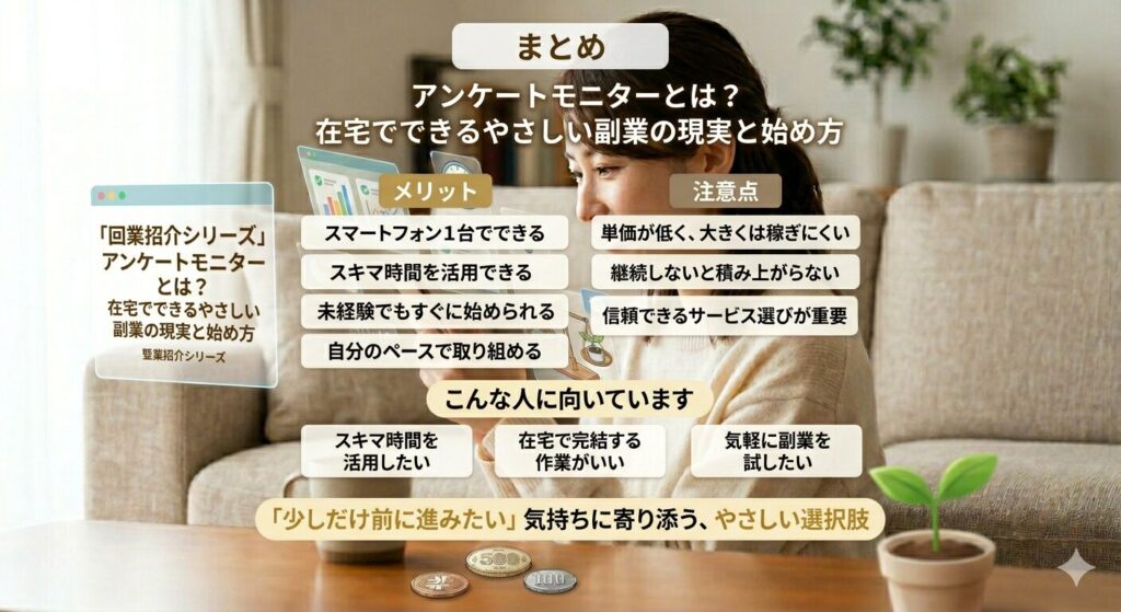 アンケートモニターは、無理なく始められる在宅副業のひとつです。