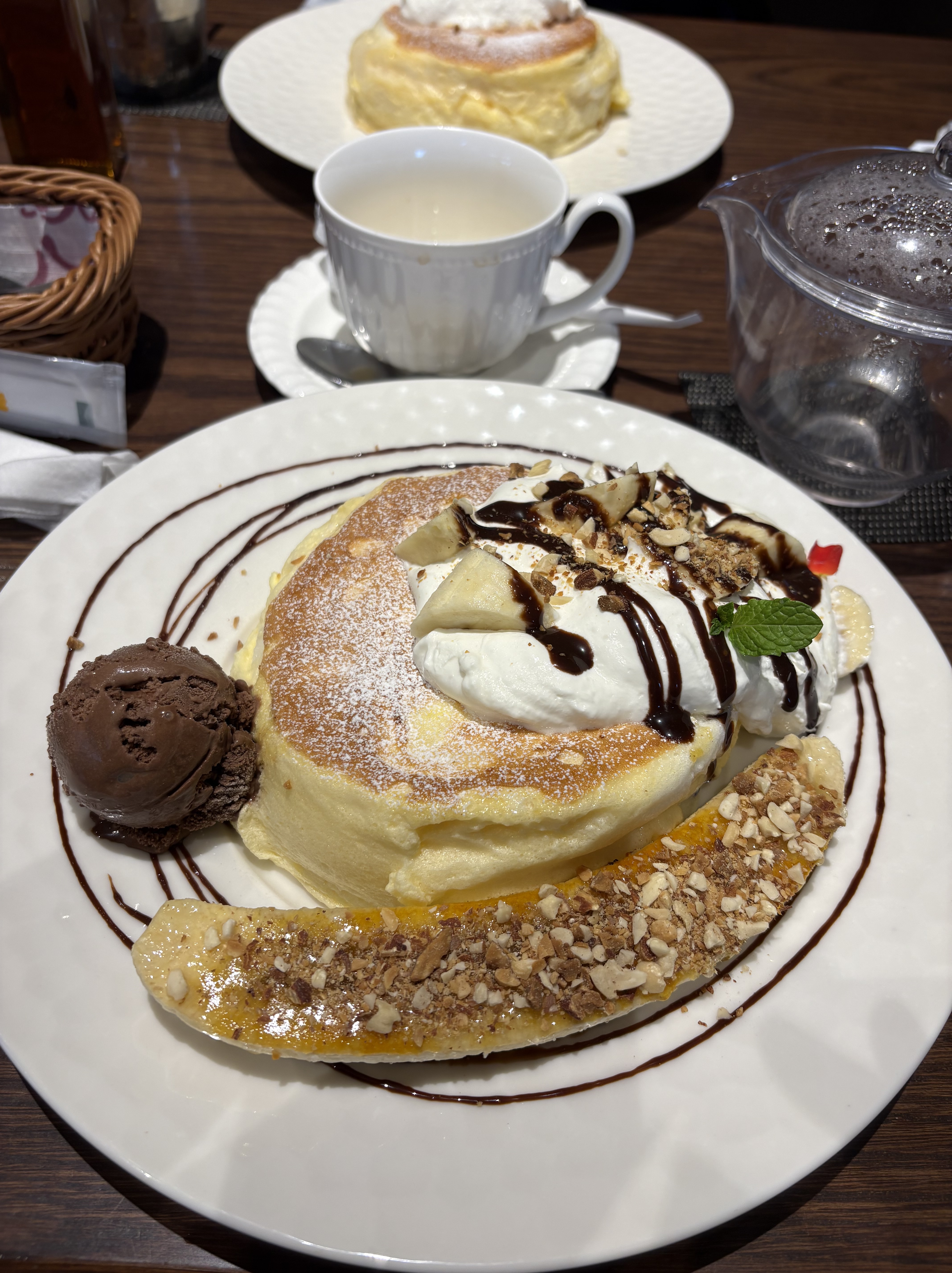 いろいろ迷った結果、この日はチョコバナナパンケーキを選びました。運ばれてきた瞬間、思わず笑顔になってしまうような見た目で、ふわふわで少し厚みのあるパンケーキにたっぷりのチョコレートソースとバナナが添えられていて、とても魅力的でした。一口食べると、やさしい甘さが口いっぱいに広がって、心まで満たされていくような感覚に包まれました。